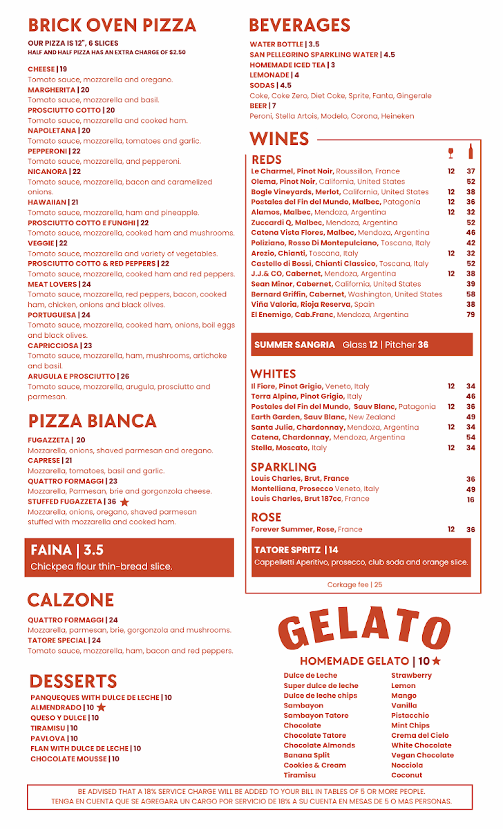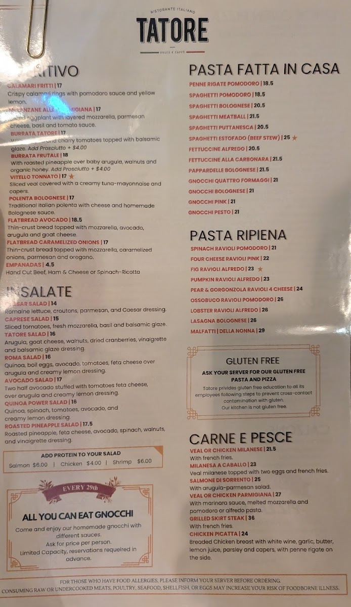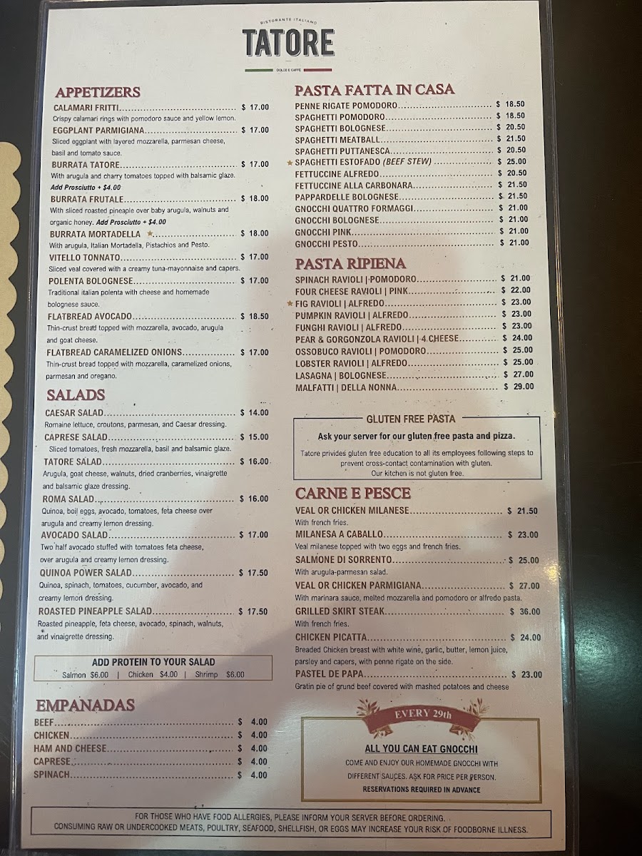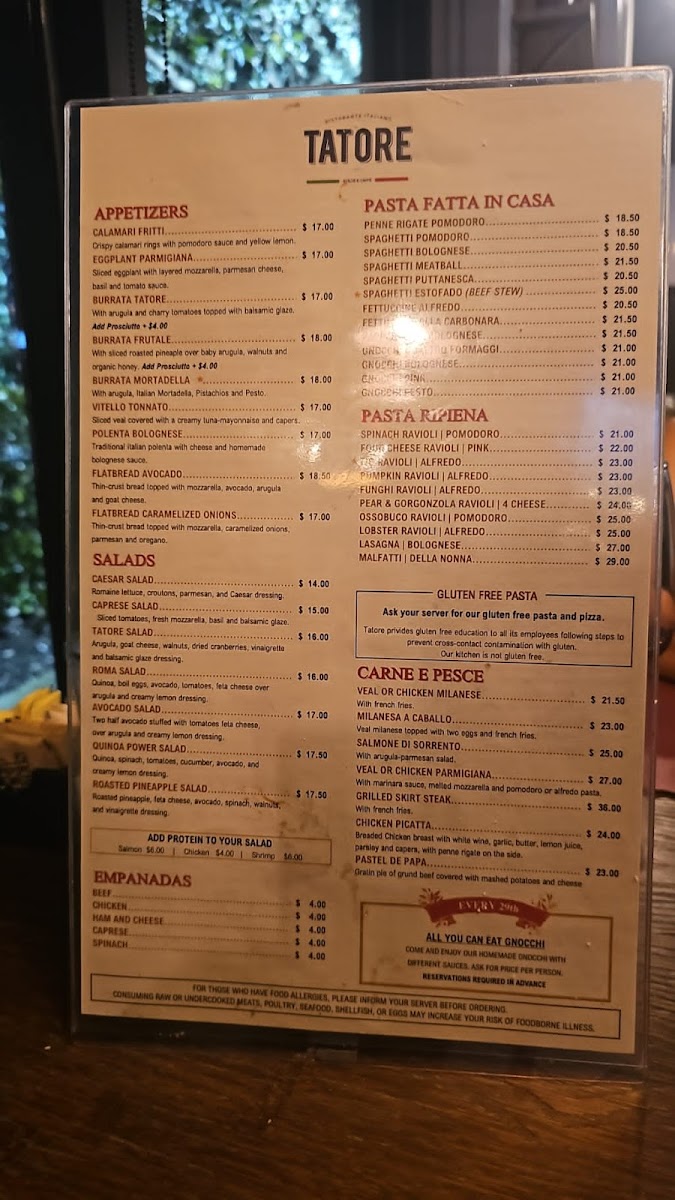 Introducing Tatore, a culinary gem located at 14730 Biscayne Blvd, North Miami Beach. This upscale restaurant blends the best of Italian and Argentinian flavors, offering a diverse menu that promises to tantalize your taste buds. Highlights include the rich Veal Milanese served with crispy fries and the delightful Smoked Salmon plate, satisfying both meat lovers and seafood enthusiasts alike. The Brick Oven Pizzas are a must-try, with the Nantanes and Fugazzeta garnering rave reviews for their authentic flavor and generous toppings. Each dish reflects the chef's dedication to freshness and creativity, as testified by patrons who praise the inviting atmosphere and attentive service. From unique appetizers to delectable desserts like Dulce de Leche ice cream, every visit to Tatore feels like a special occasion. Join the chorus of satisfied diners and experience what makes Tatore a standout choice for a memorable dining experience.